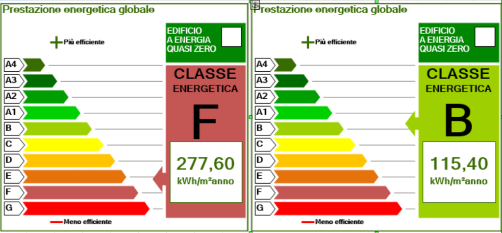 La notevole particolarità di questo intervento è rappresentato dal deciso (e straordinario) salto di classe energetica pre-post intervento, con un balzo di ben 4 classi (dalla classe F alla classe B).
